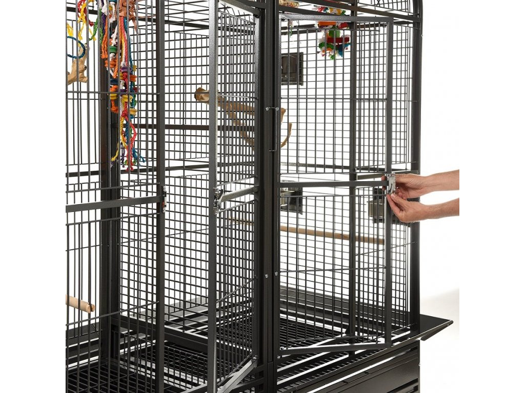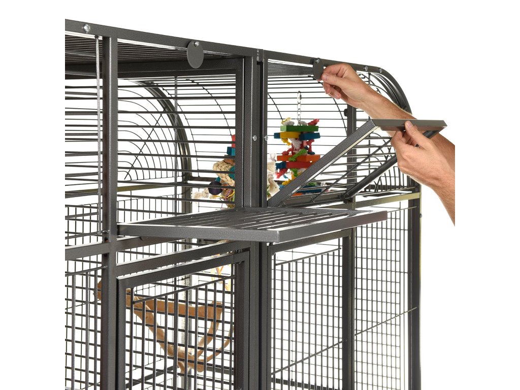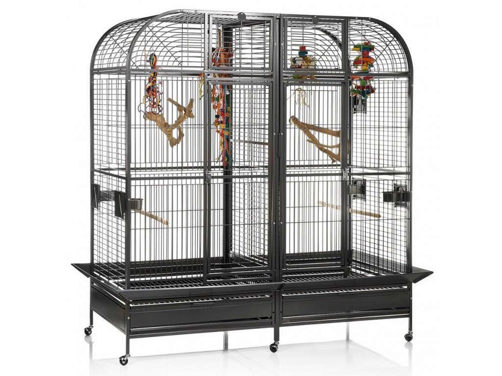 Dvojklietka pre stredné a veľké papagáje Palace vo farbe Antik (tmavá farba). Model Palace, od prestížneho výrobcu klietok Montana cages, sa podobá modelom Los Angeles a Chicago, ktoré majú preďeľovaciu mrežu, ktorá predelí klietku na dve samostatne fungujúce klietky. Obsahuje padacie dvierka, nerezové misky, bidlá, lapače nečistôt a dvierka na pripevnenie búdky na hniezdenie. Stabilné nohy na kolieskach zaručujú ľahkú manipuláciu.