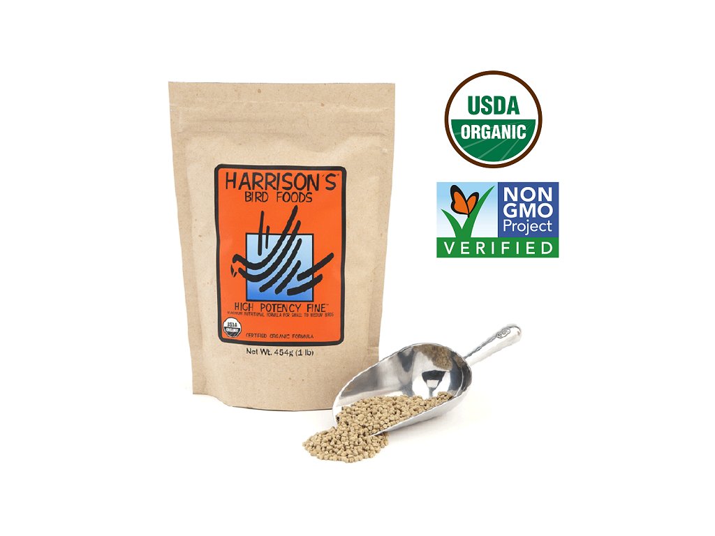 Granule pre papagáje pre menšie druhy papagájov v hniezdnom období v 450g sáčku. Granule Dr. HARRISONA pre menšie druhy papagájov v hniezdnom období. Certifikované a vyvážené bio krmivo. High Potency Fine (12% tuku).Denné krmivo s vyšším obsahom tuku, bielkovín, vitamínov a minerálov pre nižšie uvedené skupiny druhov, ostatné veľkostne podobné a príbuzné druhy, ktoré sú v období hniezdenia, preperovania alebo mladšie ako 5 mesiacov a sú určené aj na prechod týchto druhov na granulované kŕmenie. Začnite s High Potency 1-2 mesiace pred hniezdnym obdobím pre stimuláciu a zvýšte doporučené množstvo o 1/3, zdvojnásobte množstvo ovocia a zeleniny. Druh, doporučenná denná dávka High Potency Fine: Malý papagáj 2-3 čajové lyžičky (4-6g) Stredný a veľký papagáj 3-5 čajových lyžiček (6-10g) Strední a velkí loriovia 1 lyžičku (10 g) namočte v 3 lyžičkách ovocného džúsu alebo nektáru pre loriov.