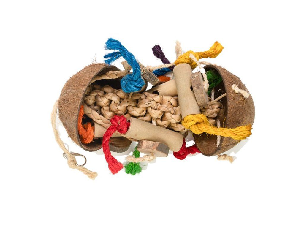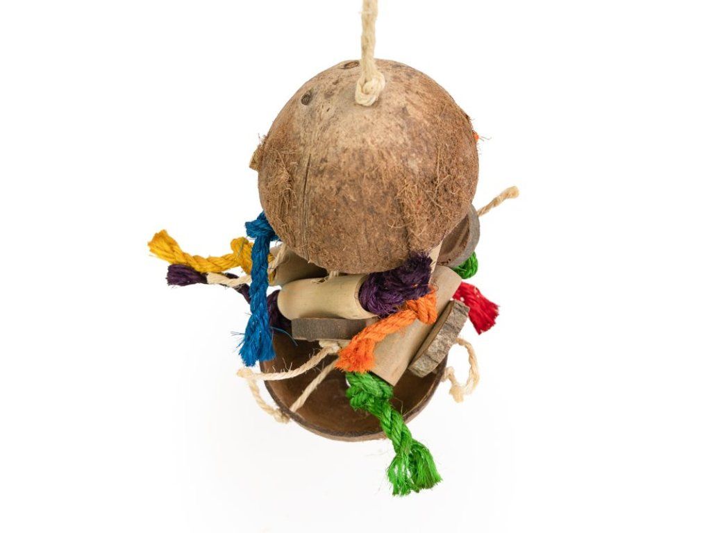 Coco Stack je závesná hračka na obohatenie okolia vyrobená z pravých kokosových škrupín, prírodného dreva a pletených rastlinných vlákien.