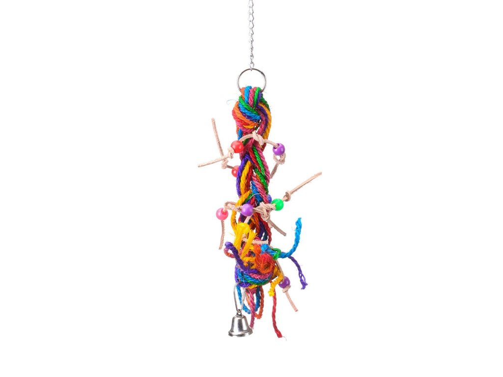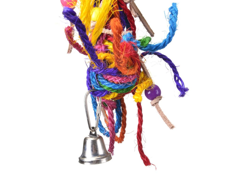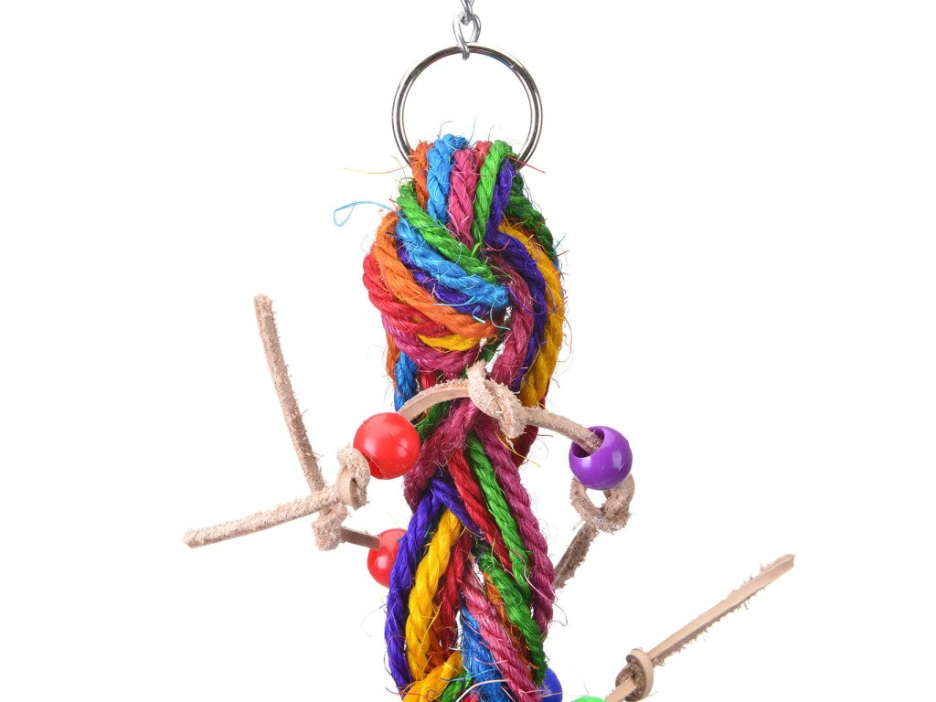 Hračka pozostáva zo sisalových špagátikov, kože a gorálok - farebná zábava pre všety menšie papagáje.