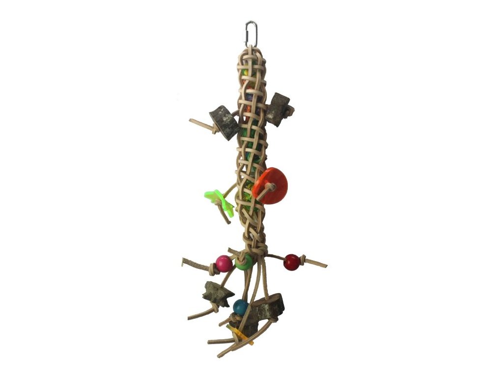 Tým, že je hračka zapletená, zvýšuje pozornosť vášho operenca. Zároveň doplnená o farebné guličky a krúžky, nuda v klietke teda nehrozí.